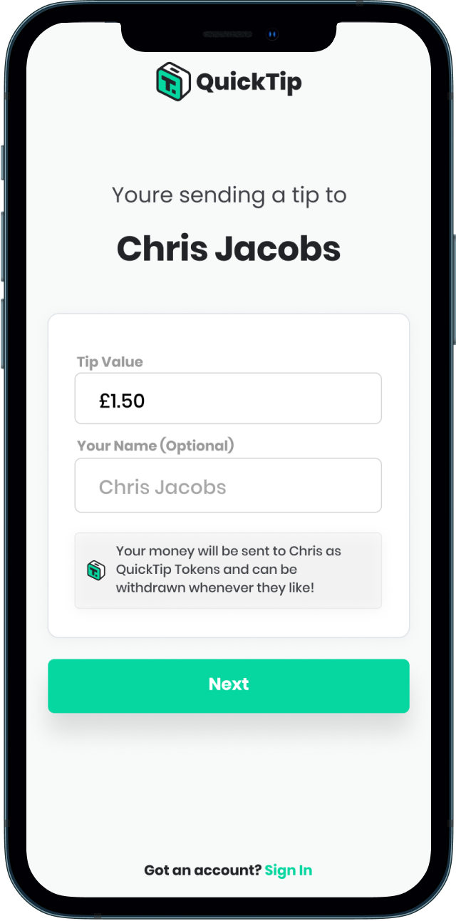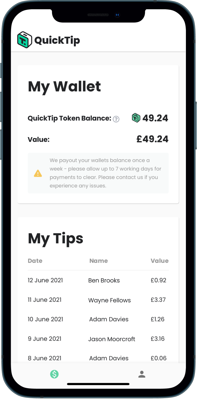 We use a proprietary technology that stores your tips as the QuickTip token. This token has a £ (GBP) value that equals £1 = 1 QuickTip token. This token is stored by us to ensure your account is always up to date with the correct balance. When you receive your tip balance, you will receive it in your bank in £.
